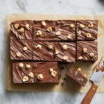 Take your chilled base out of the fridge and use a cake scraper or spatula to spread the ganache in an even layer on top. For a touch of artistry, use the back of a spoon to create gentle swirls in the ganache — a simple step that instantly elevates the look of your bars. Sprinkle toasted hazelnuts on top if you want that beautiful crunch and extra hazelnut aroma to finish things off.