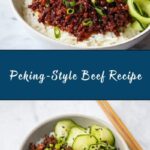- Serve: Spoon the Peking-style beef over steamed jasmine rice. Top with cucumber ribbons, sliced spring onions, toasted sesame seeds, and drizzle with sesame oil for added flavor and texture.