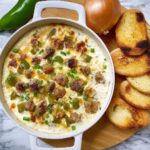 This Philly Cheesesteak Dip is a creamy, cheesy, and savory appetizer inspired by the classic Philly cheesesteak sandwich. Featuring tender chopped roast beef, caramelized onions, sautéed green bell peppers, and a blend of cream cheese, sour cream, mozzarella, and provolone cheeses, this warm dip is perfect for parties or casual gatherings. Baked to bubbly perfection and garnished with fresh parsley and green onions, it pairs wonderfully with sliced baguette, tortilla chips, crackers, or fresh vegetables.