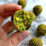 - 1/2 cup finely chopped or ground pistachios (for rolling)