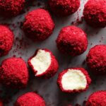Now, roll each cream cheese ball in the reserved red velvet cake crumbs until fully coated, creating a visually stunning red crust around the creamy center. Return the coated bites to the baking sheet and refrigerate until you’re ready to serve. This keeps them firm and makes them the perfect little bite-sized dessert.