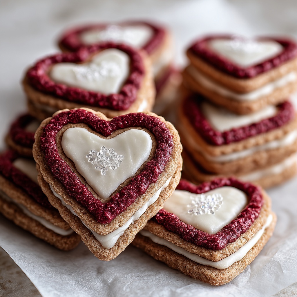 Delight in these charming Red Velvet Linzer Cookies featuring a tender, cocoa-infused dough filled with luscious cream cheese frosting, dusted with powdered sugar, and shaped into adorable hearts—perfect for festive occasions or a sweet treat any day.