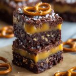 Drizzle the reserved caramel over the chocolate layer and sprinkle the roughly chopped pretzels and a pinch of kosher salt on top. If the reserved caramel has hardened, simply warm it back in the microwave for a few seconds. Let your brownies cool for about 30 minutes before slicing—this cooling period lets everything set perfectly for clean cuts and the best texture experience.