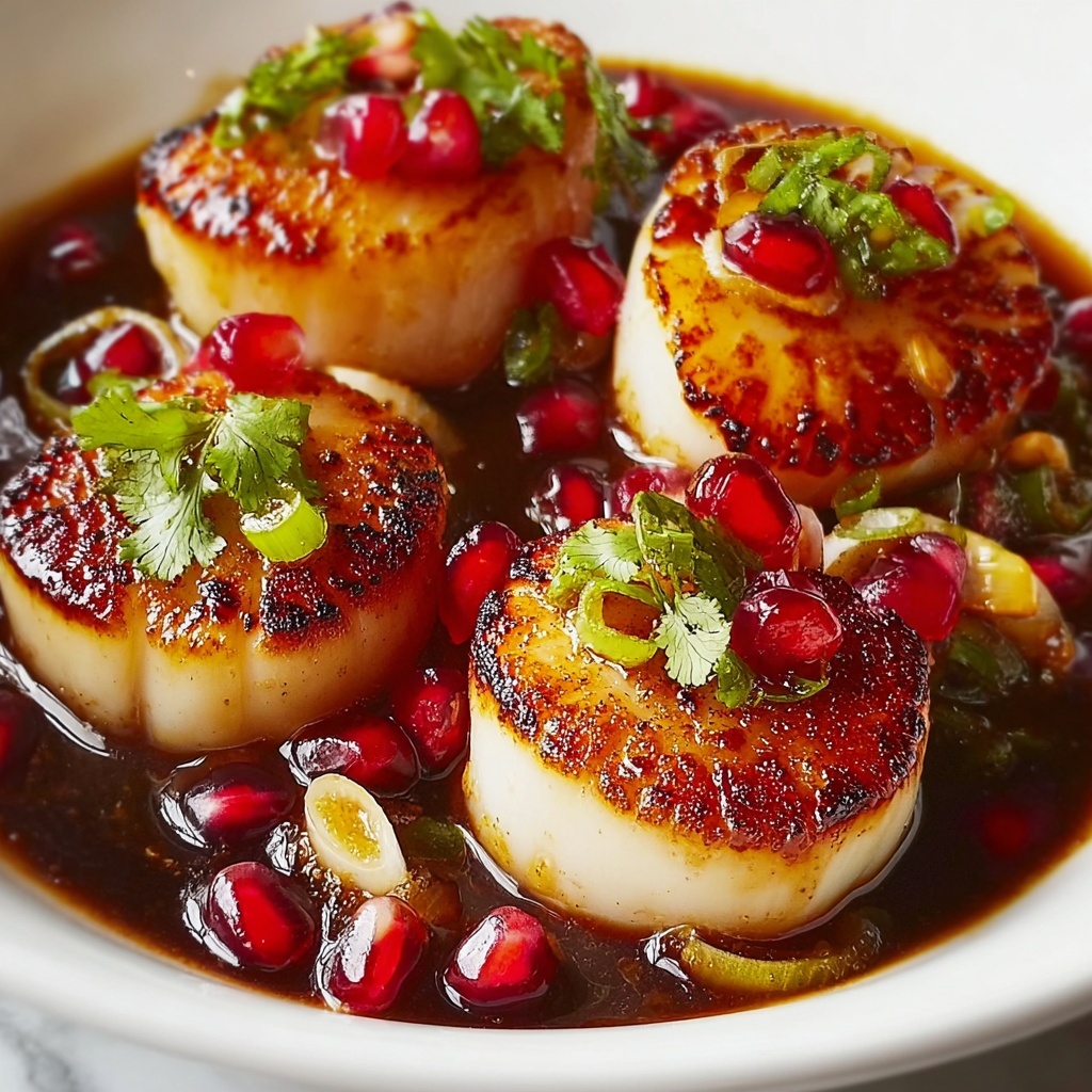 For a show-stopping presentation, arrange the scallops in a circle around a drizzle of the lemon-pomegranate sauce on a white plate, letting the vibrant red seeds contrast against the creamy scallops. You can also serve them skewered over the greens for a fun, canapé-style appetizer. Presentation is where you can really let your creativity shine with this recipe.