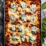 This Sheet Pan Lasagna is a quick and delicious twist on traditional lasagna, featuring broken lasagna noodles baked with a flavorful meat sauce, creamy ricotta and sautéed spinach mixture, topped with melted mozzarella and Parmesan cheeses. Perfect for an easy weeknight dinner that serves eight.