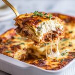 Grease a 9×13-inch baking dish and layer half of the creamy noodles at the bottom. Spread half of the beef mixture over the noodles and sprinkle with half of the shredded cheese. Repeat the layers with the remaining noodles, beef mixture, and cheese, making sure every layer is evenly spread for balanced flavor in every bite.