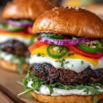 A flavorful and spicy jalapeño pepper jack burger featuring juicy beef patties topped with melted pepper jack cheese, sautéed jalapeños, and a smoky chipotle mayo, served on toasted brioche buns with fresh arugula, tomato, and red onion for a perfect balance of heat and freshness.