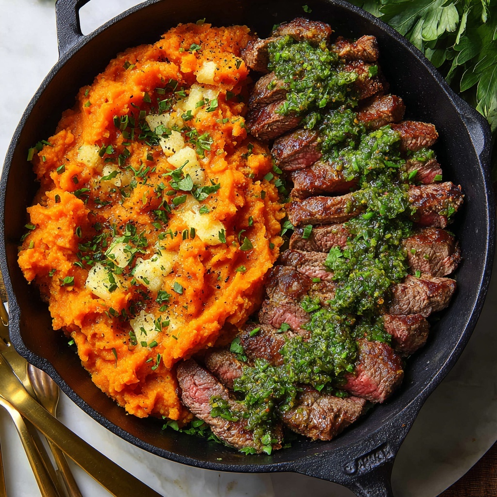 A flavorful and hearty main course featuring perfectly seared beef steaks served over creamy mashed sweet potatoes, complemented by a vibrant and tangy green herb sauce made with fresh parsley and cilantro. This dish combines the rich taste of steak with the natural sweetness of root vegetables and zesty herbaceous notes for a balanced and satisfying meal.