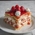 This Strawberry Crepe Cake is a delightful layered dessert featuring delicate crepes stacked with whipped cream and fresh strawberries. The cake is chilled to set, allowing the flavors to meld beautifully, then topped with a luscious strawberry glaze and garnished with whole strawberries for an elegant presentation.