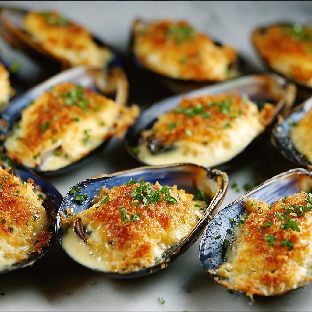 Place the tray in the preheated oven and bake for 10 to 12 minutes. You’re looking for the cheese to be melted fully and lightly golden on top. This bubbling, golden topping signals that your stuffed baked mussels are ready to be devoured. Once baked, remove from the oven and, if you like, sprinkle chopped parsley over the top to add a burst of fresh color and brightness.