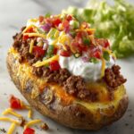 Taco Potatoes are a delicious, hearty meal featuring oven-baked russet potatoes stuffed with seasoned ground beef and topped with cheddar cheese, sour cream, salsa, and fresh garnishes. This Mexican-American inspired dish offers a perfect blend of comforting flavors and textures, ideal for an easy weeknight dinner or taco night.