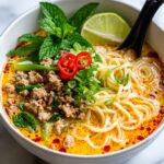 This Thai Red Curry Noodle Soup is a vibrant and flavorful dish perfect for a quick and comforting meal. Creamy coconut milk combined with fragrant red curry paste, fresh ginger, garlic, and lime juice creates a rich broth that beautifully complements tender rice noodles and fresh vegetables. Ready in just 25 minutes, this soup offers a delightful balance of spicy, tangy, and savory flavors, garnished with cilantro and bell peppers for a fresh finish.