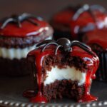 These Vampire Bite Halloween Cupcakes feature moist red velvet cupcakes filled with a luscious red velvet cream center and topped with pale skin-tone buttercream. Decorated with candy fangs and dripping edible red gel, these spooky treats are perfect for Halloween parties and will delight guests with their creepy aesthetic and delicious flavor.