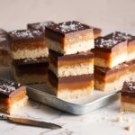 - Slice and Serve: To cut the bars cleanly, heat a sharp knife by placing it in boiling water, then dry it thoroughly. Use the warmed knife to gently slice through the layers, helping the blade glide smoothly through the chocolate and caramel.
