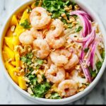 Begin by thinly slicing napa cabbage and cutting jicama into matchsticks to build a crisp, refreshing base. Peel the green mango and cut it into thick matchsticks that will provide a tangy chewiness integral to the salad’s character. Thinly slice the red onion and diagonally cut the scallions, releasing their mild onion flavor. If your shrimp aren’t already cooked and peeled, prepare them now; you’ll add these tender seafood morsels just before serving to keep them succulent.