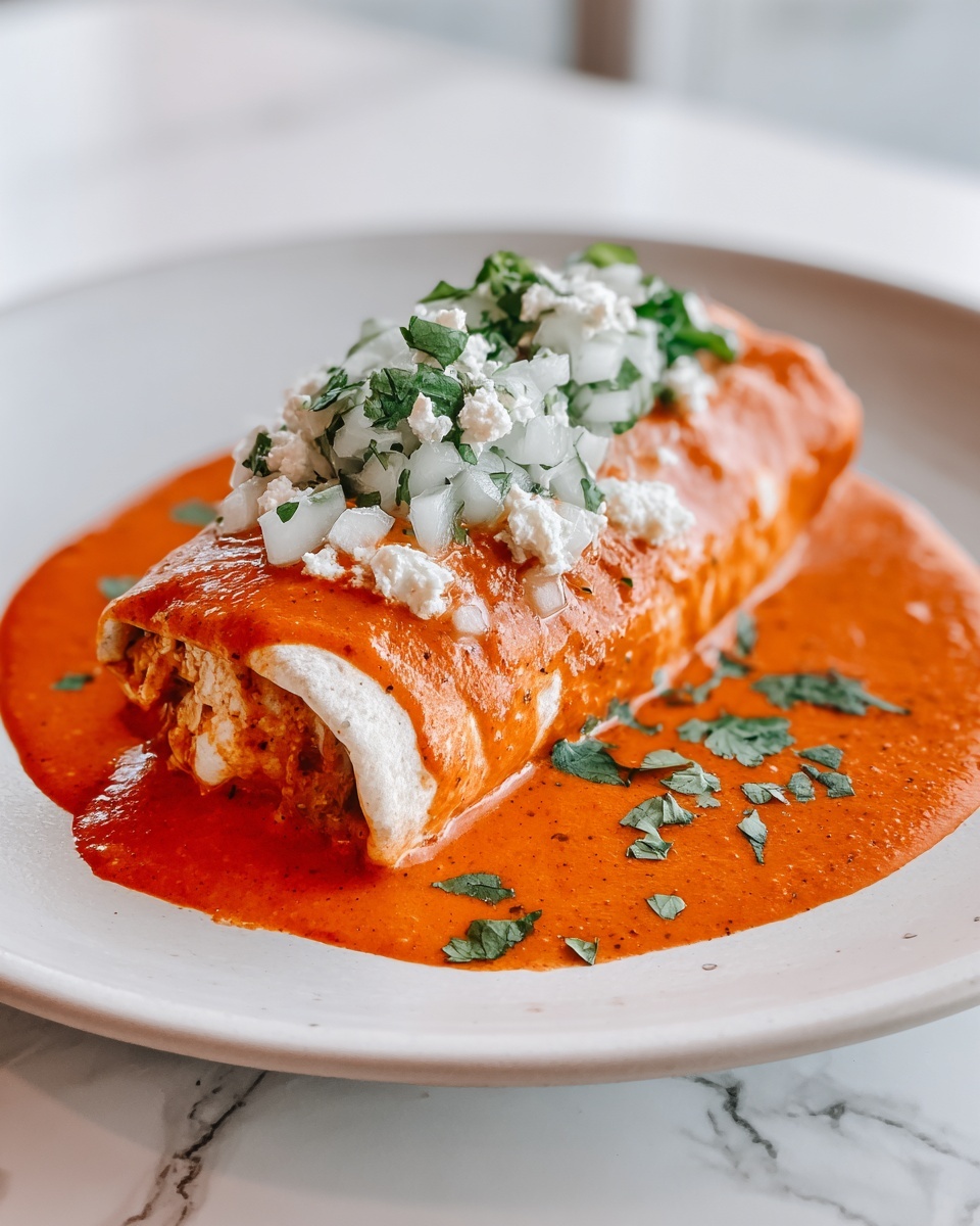Finishing with fresh cilantro sprigs really brightens up these wet burritos and adds a lovely herbal note that cuts through the richness. A dollop of sour cream on the side not only adds creaminess but also tempers any extra heat for a perfectly balanced bite. Guacamole and spicy salsa make wonderful companions as well, bringing fresh, zesty elements to the plate.